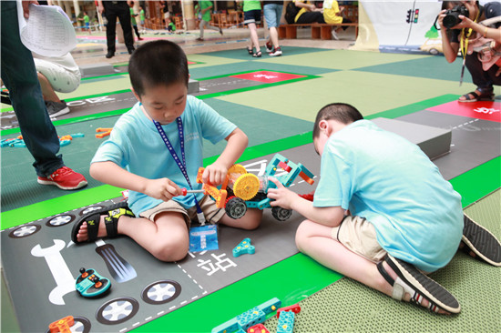 挑战赛要求小朋友积木搭建一辆小车,完成穿越龙门、跨越障碍、飞越“火山”和推动“巨石”、清理“垃圾”等多项“艰巨”任务,比试完成任务情况和时间长短,考察小朋友动手搭建、团队合作和现场应变能力。搭建赛则希望小朋友分别搭建“我心中的小学校园”和“中国桥梁”两个主题积木场景,不仅要合理搭配五颜六色的积木让作品“艳”起来,还要发挥他们的创新思维让作品“新”起来,运用机械原理和动力装置让作品“动”起来,也要在评委面前口述作品的构思,描绘作品的“蓝图”。