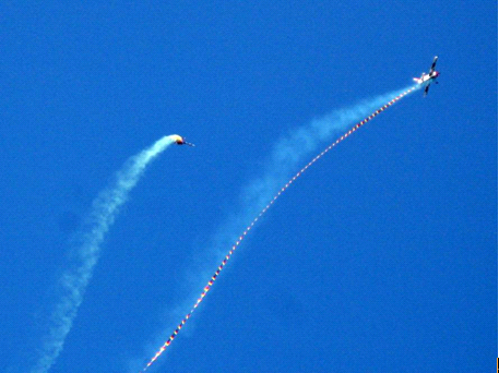 遥控直升机在庄严的国歌声中将国旗悬挂在空中。近百枚大小火箭呼啸升空,瞬间化作一个个降落伞,宛如朵朵彩花在空中飘舞。随后,花式飞机伴随着悠扬的圆舞曲表演了古典的“空中芭蕾”,两架直升机配合着快节奏的韵律互动展演了现代气息的“空中迪斯科”,空中彩带、拉烟飞行等精彩纷呈的空中节目接连上演。